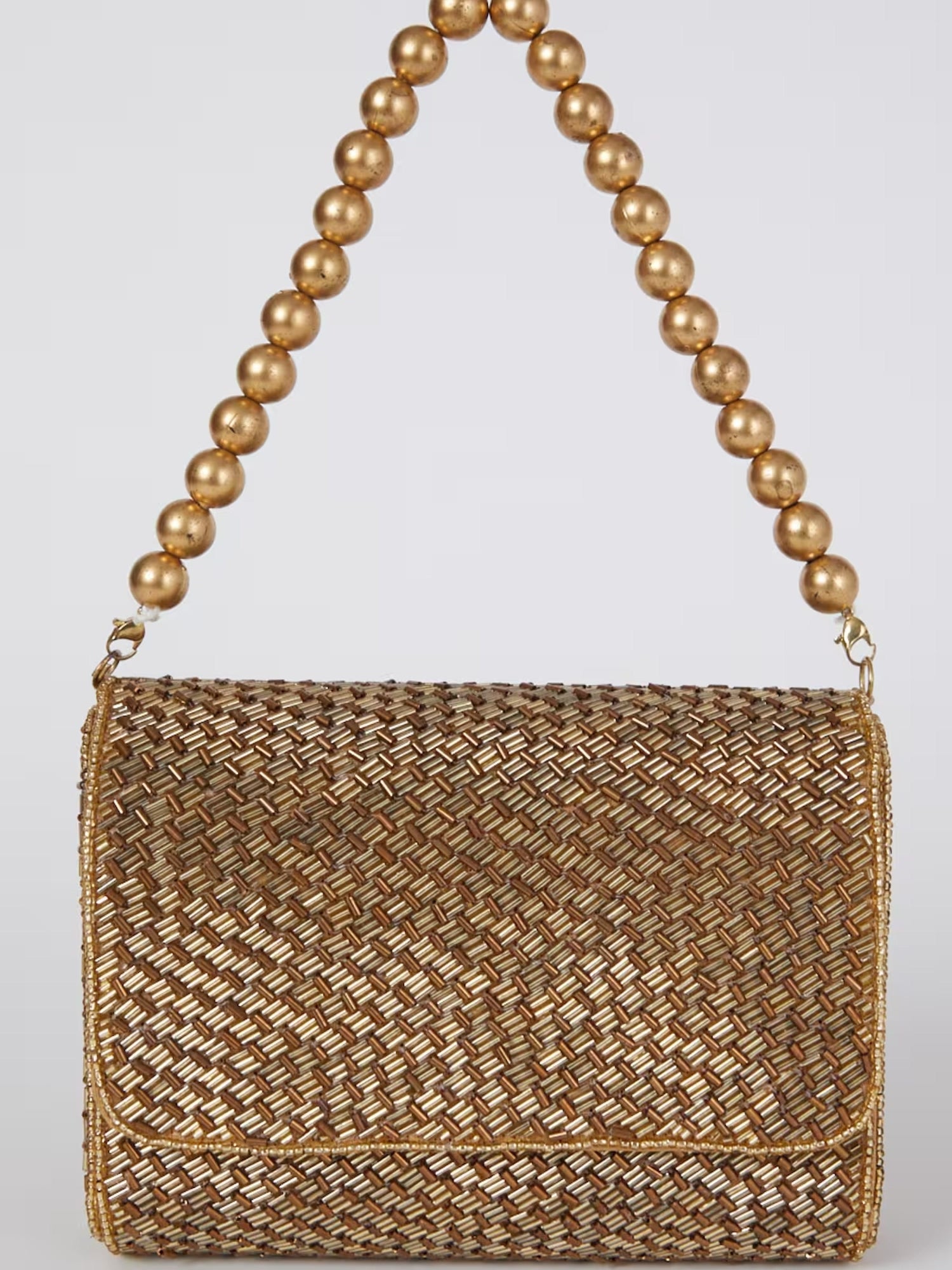 Add a touch of glamour to your everyday look with our stunning Flapover Handembroidered bag, featuring exquisite Bugle beads work on both sides. The gold beaded handle adds a hint of luxury and makes it the perfect accessory for any occasion. Don't miss out on this versatile and effortless piece that will elevate your style game!