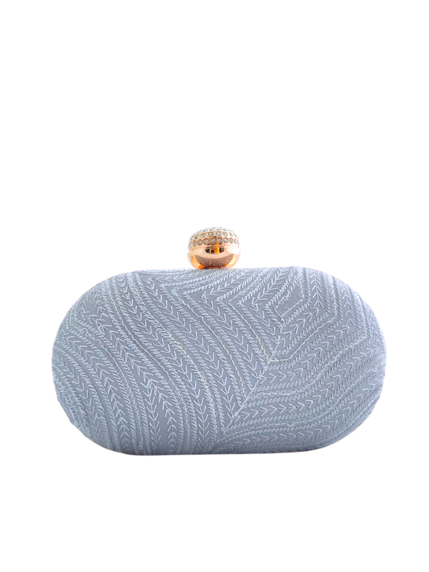 Soft as a cloud, Baadal features intricate threadwork in a soothing blue-grey hue. Accented with clear sequins to bring shimmer on a unique capsule shaped. Crystal-studded knob and a long sling chain make this clutch a must have for every wardrobe.