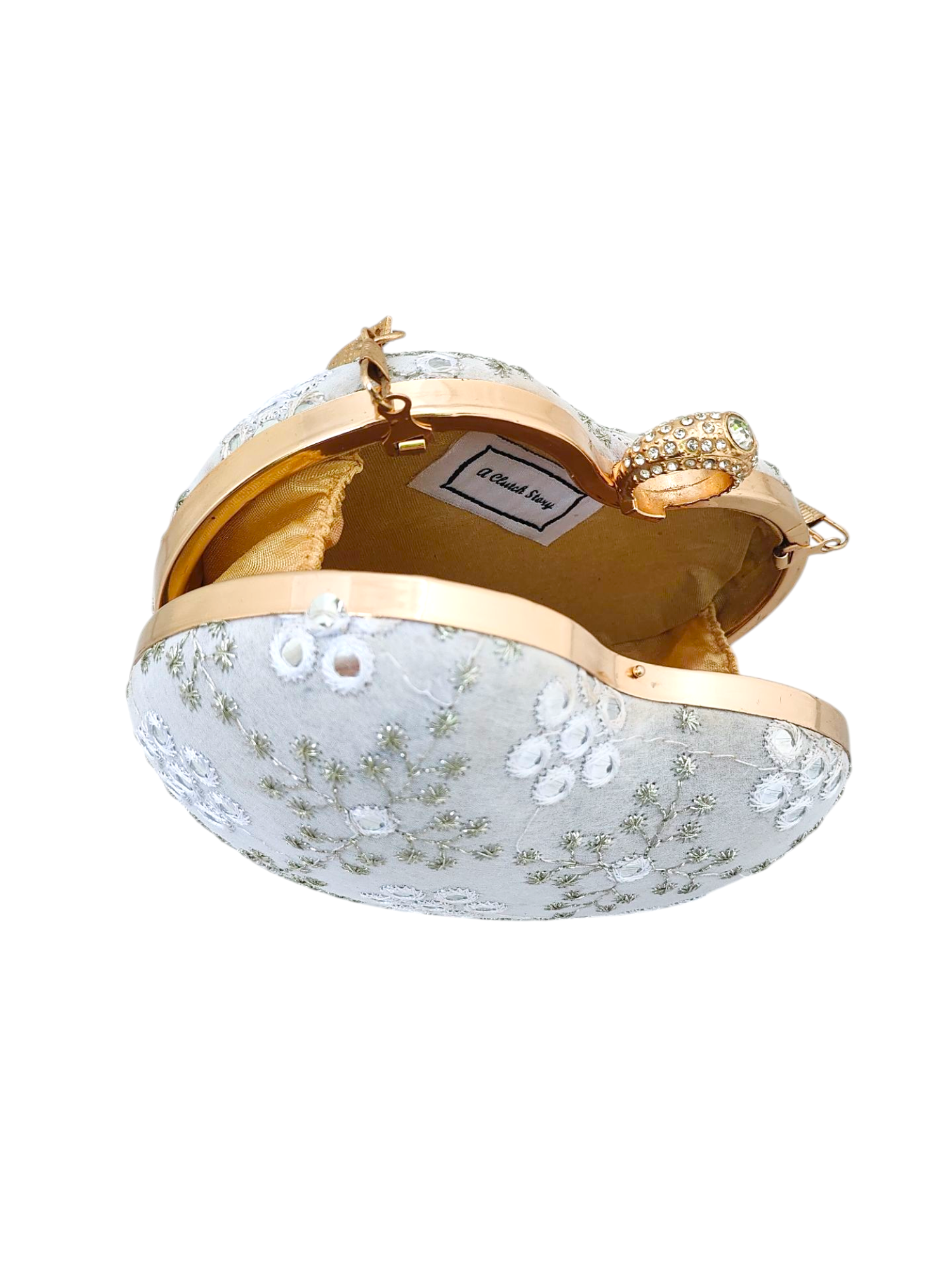 Shaped like a heart and adorned with delicate mirror embroidery and sequins, Roshni glows with understated charm. Its embellished ring clasp and gold handle add just the right touch of sparkle—perfect for when you want your light to shine through.