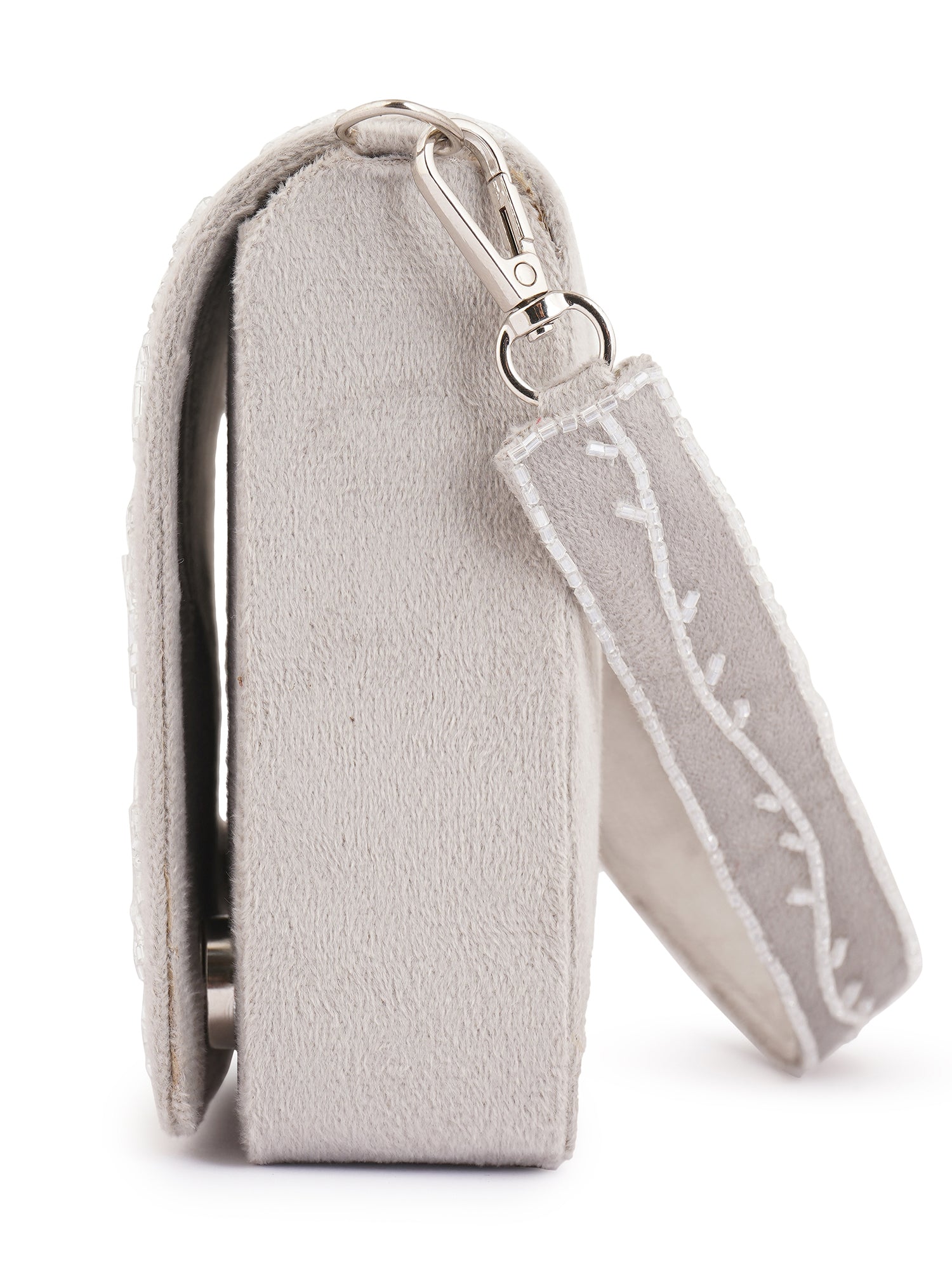 A sleek velvet box clutch adorned with delicate silver thread embroidery in floral motifs. Minimal, elegant, and versatile — it comes with a detachable handle, making it perfect to carry from festive events to evening soirées with effortless sophistication.